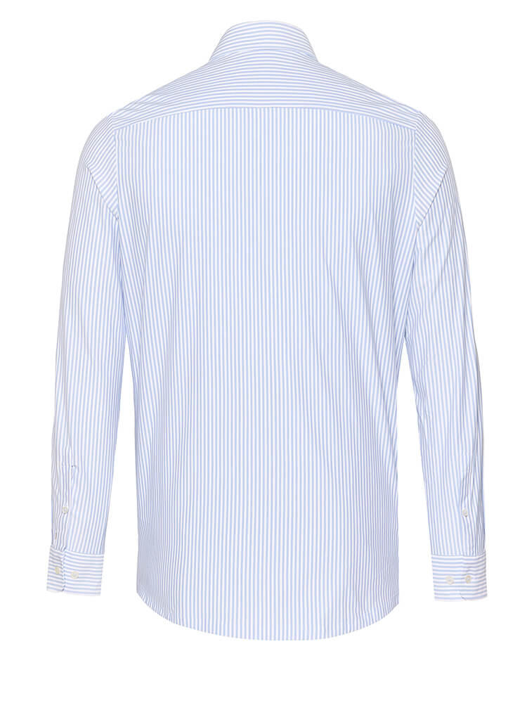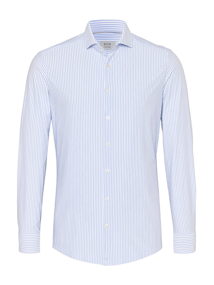 Das elegante Jerseyhemd aus der PURE Functional Kollektion steht für den schlanken und modebewussten Mann von heute. Ein körperbetonter Schnitt verbunden mit modischen Produktdetails verspricht einen hohen Komfort und macht dieses Hemd zu einem Künstler der Kombination. Das gestreifte Herrenhemd in der Farbe hellblau darf in keiner Herrengarderobe fehlen und kann mit dem eleganten und klassischen Haifisch Kragen zu jedem Anlass sowie im Alltag getragen werden. Mit einer schmalen Krawatte und einem kleinen Krawattenknoten kommt dieses PURE Functional Herrenhemd am besten zur Geltung.